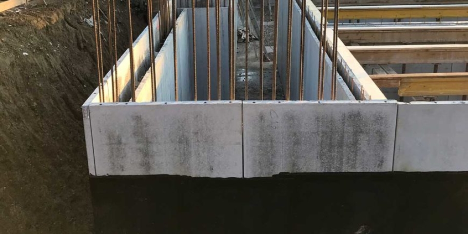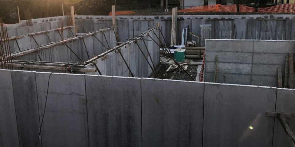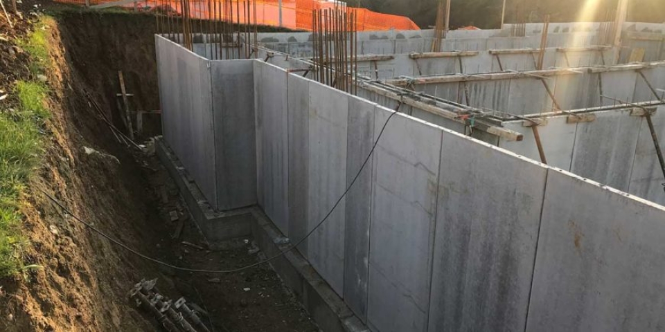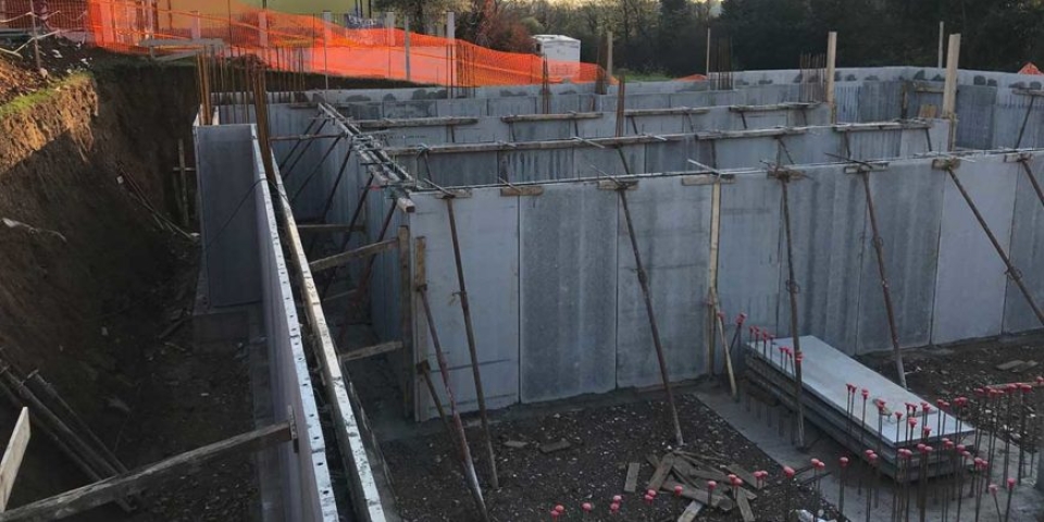 Le due lastre funzionano da cassero ed hanno un’armatura minima di confezione, con la possibilità di inserire l’armatura verticale aggiuntiva, così come indicata dal Progettista Generale delle Strutture. Nelle sezioni di attacco tra la fondazione ed il muro, i ferri di ripresa saranno maggiorati di almeno un diametro per tenere conto del maggiore copriferro dato dallo spessore delle lastre e della conseguente diminuzione della sezione utile.