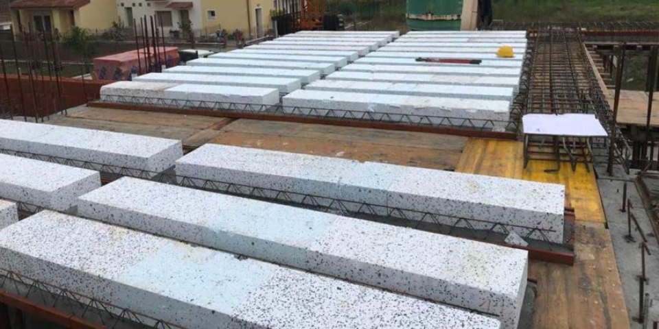Nella successiva fase di riempimento con calcestruzzo o malta cementizia delle nervature laterali, nelle quali sono inseriti traliccio ed acciaio di armatura, una rastrematura del getto all’estradosso dell’elemento in laterizio consente di posizionare componenti di alleggerimento di dimensioni adeguate alle richieste strutturali di progetto.